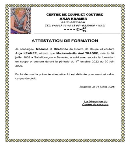 Op de crèche Annechien et Roelly komen dagelijks 30 kinderen en het Centre de Coupe et Couture Anja Kramer heeft op dit moment 10 leerlingen die het coupeuse vak leren. Afgelopen juli heeft Ami Traore met succes haar opleiding aan het Centre de Coupe et Couture afgerond en haar certificaat gekregen. Wij wensen haar veel succes voor de toekomst.