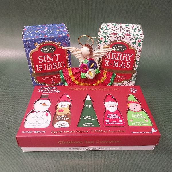 Met een pakje Sint is Jarig en Merry X-Mas thee maak je iedere theeliefhebber blij. Nieuw is de Christmas Tree Collection van English Tea Shop. De tien papieren kerstfiguren, met daarin een theezakje, hebben een gouden lusje om ze mee in de boom te hangen. Ook leuk voor het kerstontbijt.