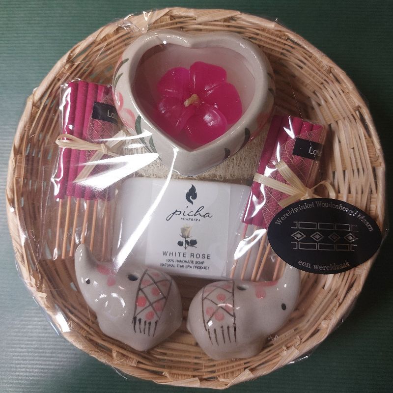 Een schattige weggever is dit mandje met handgemaakte wierrook-houdertjes, wierrook, kaarsje en stukje handzeep. In de winkel hebben we meerdere varianten van dit pakketje. Ook leuk: Zelf een cadeaumandje samenstellen. Onze vrijwilligers denken graag met u mee.